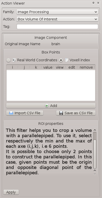 Helps you to crop a volume to keep only an interesting subsample. You only need to select 2 or 6 points defining a parallelepiped to crop within the volumic image. This action has a widget allowing the user to select those points.